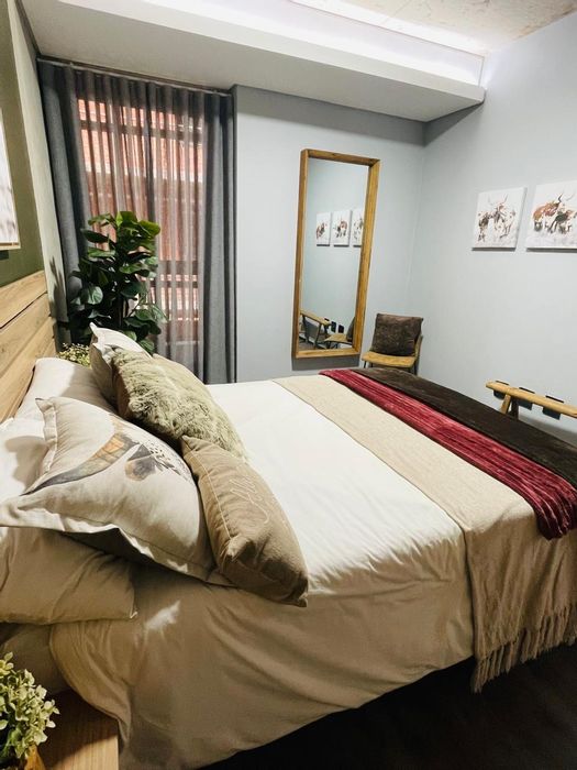 Industrial-chic Menlo Park living with high-volume ceilings and exposed brick, private entrance and built-in braai — close to top schools, Brooklyn Mall and Menlyn. Two beds, two baths.