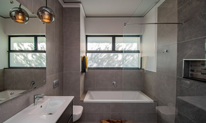 Live sustainably in Menlopark's Greenlyn Terrace full-title security village near amenities — off-grid 5kW solar with 5,000L water tank, mezzanine study, three bedrooms, two-and-a-half bathrooms.