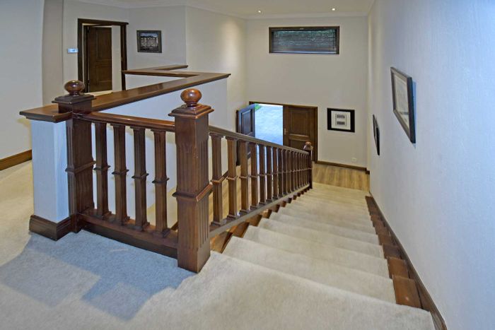 Entertainer's sanctuary in boomed-off Lonehill, set on lush grounds with pool, bar-lined lounge and grand stone staircase; chef's kitchen, guest suite, four garages and borehole.