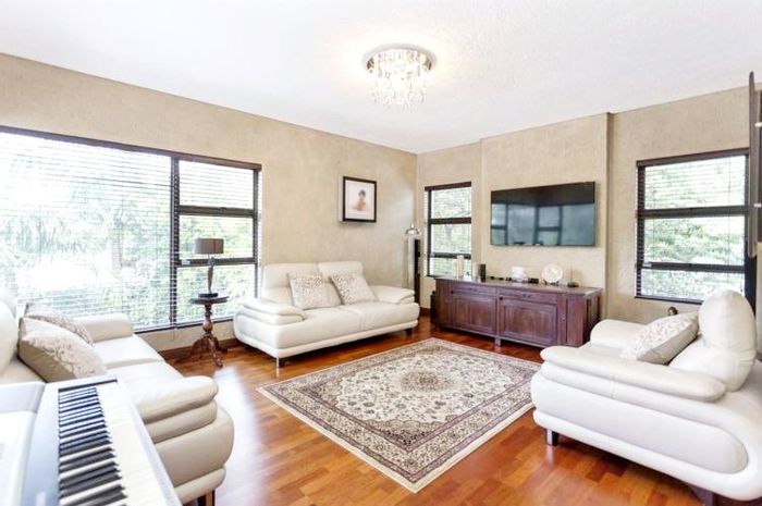 Relax and entertain in River Club's leafy, secure enclave near Sandton — expansive landscaped garden with pool and gourmet kitchen. Four bedrooms, study, and multiple covered parking.
