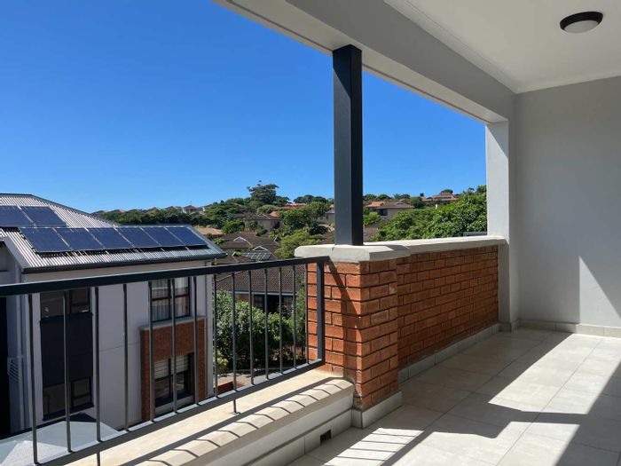 Relaxed coastal living in Ballito with leafy garden views from a spacious undercover balcony; open-plan living and granite kitchen, three bedrooms, two bathrooms and lock-up garage.