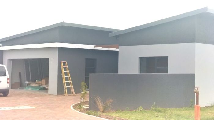 Entertainer's elevated retreat overlooking Palms Lakes valley, modern finishes and a covered patio with braai and private garden. Open-plan living, scullery, three bedrooms, two bathrooms, double garage.