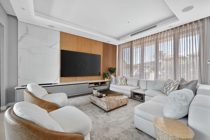 Resort-style living in Port Zimbali, Ballito, with sunlit entertaining and pool deck. Private lift links to an eight-car supercar basement. Four bedrooms, five bathrooms.
