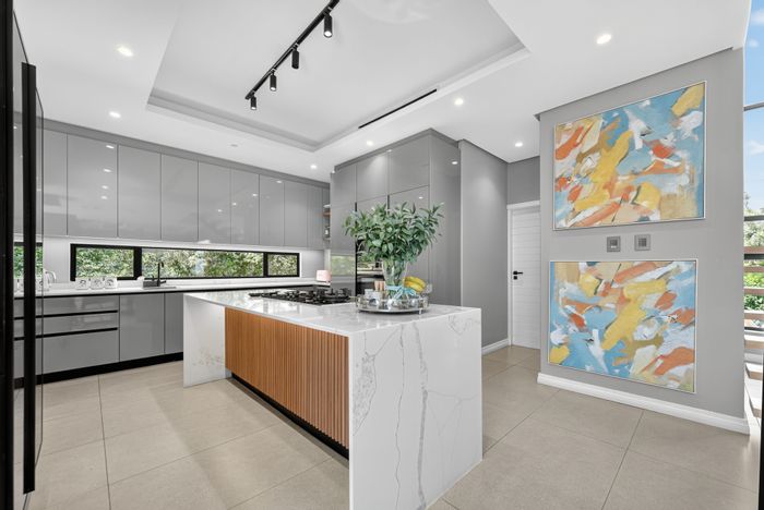 Relaxed modern living in a secure, well-maintained estate with sea-view main bedroom; sleek Caesarstone kitchen with island and scullery, private garden, two beds, two baths, double garage.