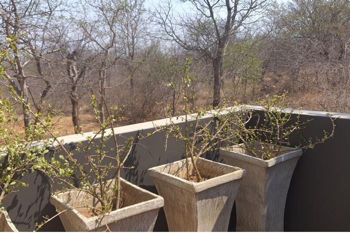 Renovated first-floor apartment in Wild Fig Complex, central Hoedspruit — elevated privacy, granite kitchen and private veranda overlooking manicured grounds, communal pool and braai. Two beds, covered parking.