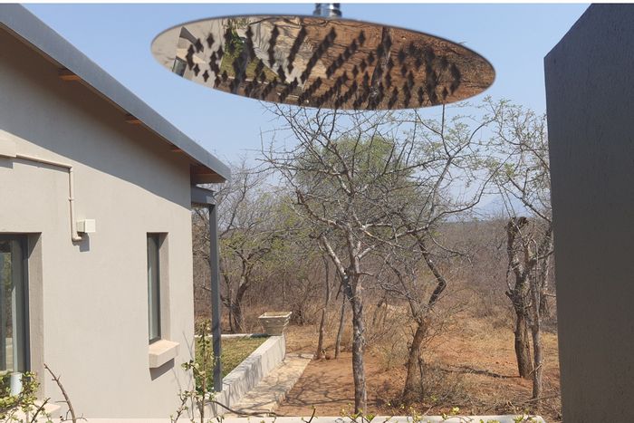 Embrace safari lifestyle with private airstrip access and Drakensberg views in Hoedspruit; modern open-plan home with pool and outside shower, three beds, two baths, double garage.