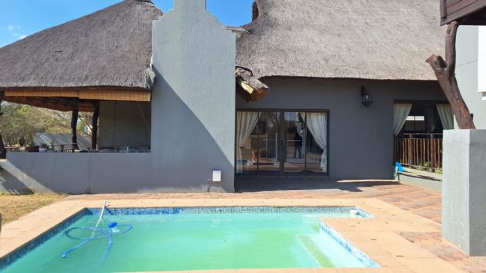 Bushveld entertainer backing onto a greenbelt with roaming wildlife in Koro Creek Bushveld Golf Estate — enclosed braai-ready entertainment room, oversized hobby studio and seamless indoor-outdoor living. 3 beds, 2 baths.