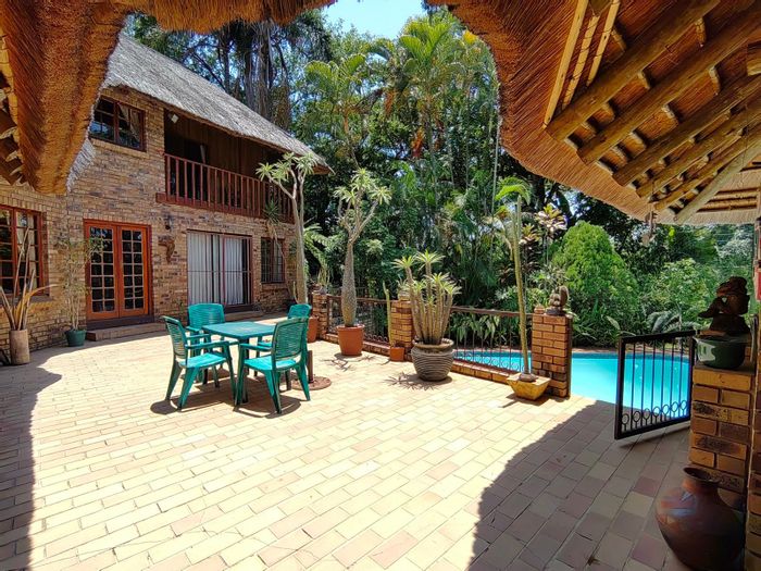 Relaxed family living in popular Arbor Park, featuring thatched character, indoor-outdoor flow to a sparkling pool and landscaped garden, plus a self-contained 1-bed flatlet — five beds, five baths.