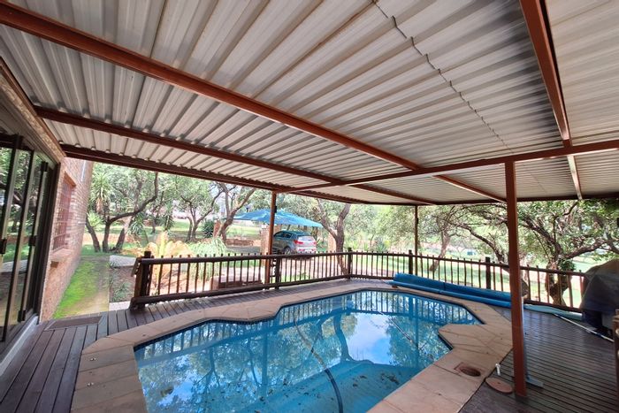 Serene bushveld living in Kranspoort Vakansiedorp, minutes from Loskop Dam — private pool, lush artistic gardens with free-roaming wildlife, entertainment bar and jacuzzi; three bedrooms, two baths.