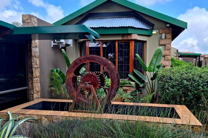 Serene bushveld living in Kranspoort Vakansiedorp, minutes from Loskop Dam — private pool, lush artistic gardens with free-roaming wildlife, entertainment bar and jacuzzi; three bedrooms, two baths.