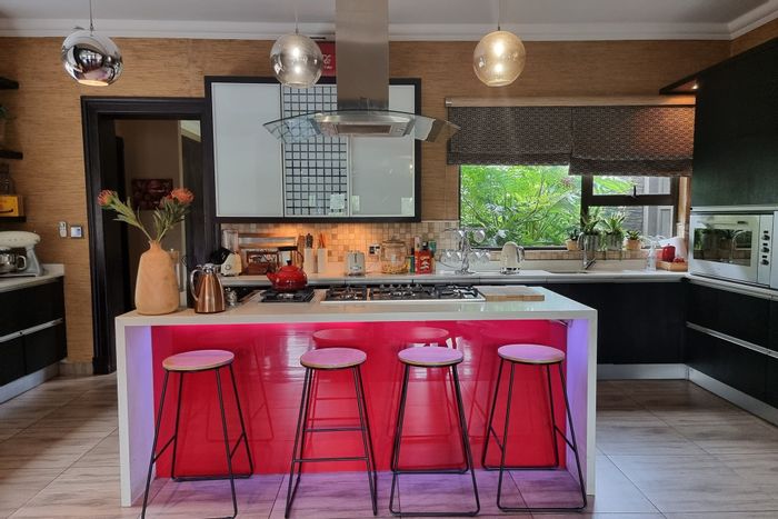 Entertainer's dream in Aerorand—modern open-plan living with indoor and enclosed outdoor braai, private patio off main bedroom and veggie garden; five bedrooms, four bathrooms, double garage.
