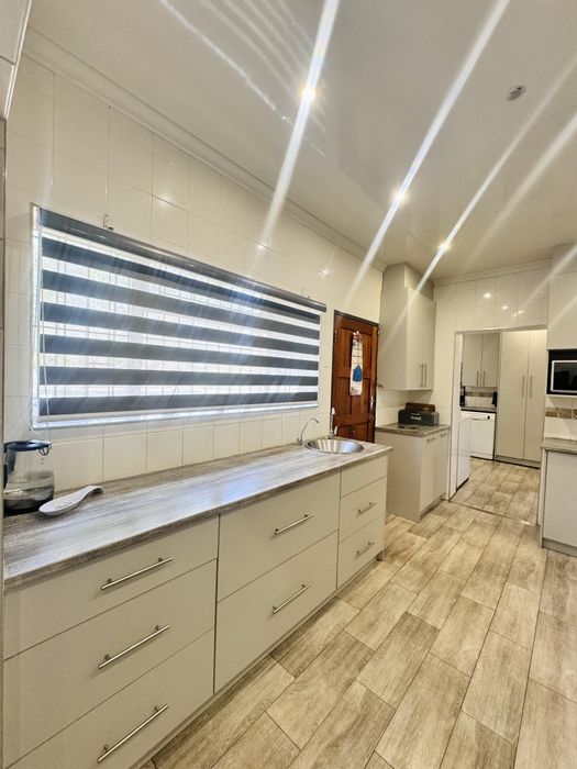 Entertainer's haven in Jackaroo Park with sparkling pool, built-in bar and granite kitchen; solar geyser, 200L backup tank and electric fencing. 3 beds, 2 baths, 2 garages, 2 carports.