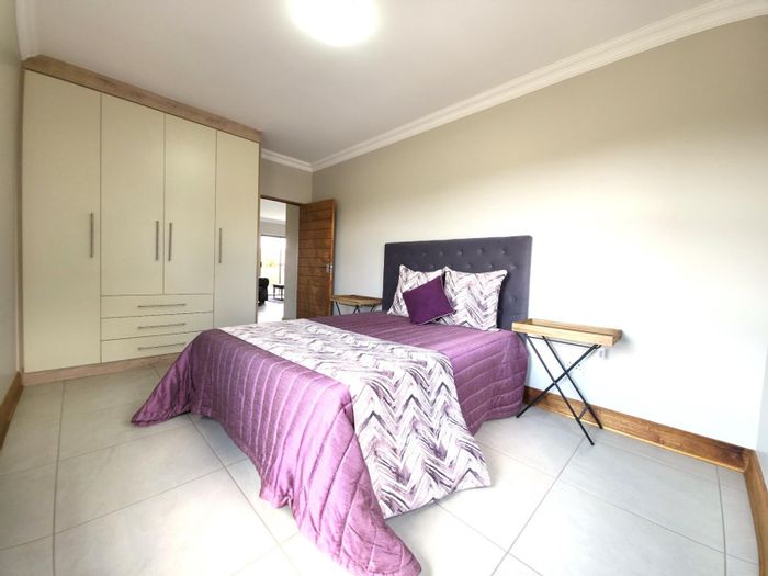 Relaxed family living in Bhubezi Village, Melodie with secure, central convenience and sunny covered patio overlooking a private garden — extra-large garage with built-in storage; three bedrooms, two baths.