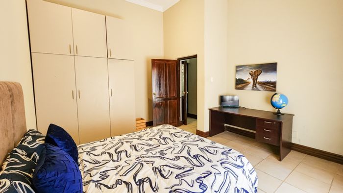 Entertainers' retreat in Hartbeespoort Wildlife Estate, overlooking Hartbeespoort Dam and mountains, with balconies watching roaming wildlife and built-in braai. Four bedrooms, four bathrooms, triple garage.