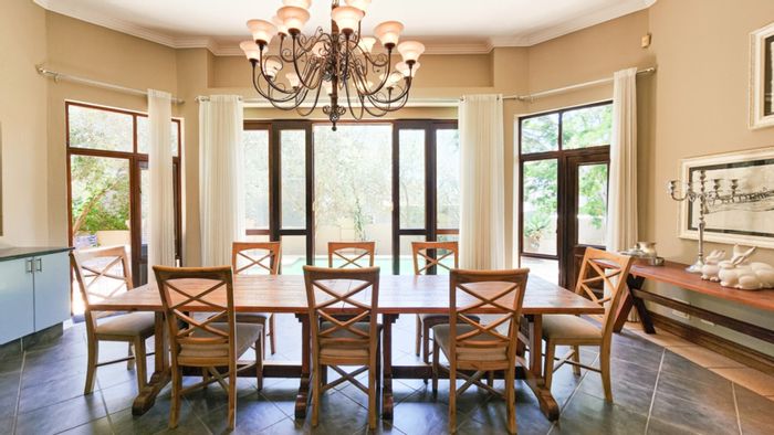 Estate living in Xanadu Nature Estate, Hartbeespoort — verdant surrounds and top security. Entertain from an enclosed patio with gas braai and pool views; five bedrooms, three bathrooms.