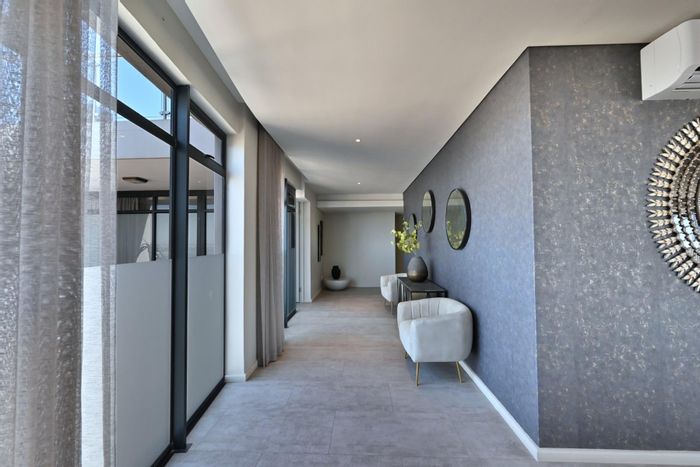 Postcard-style coastal living in Bloubergstrand's Aquarius — full-floor penthouse with floor-to-ceiling glazing, broad sunset terraces and a gourmet island kitchen; four bedrooms, secure basement parking.