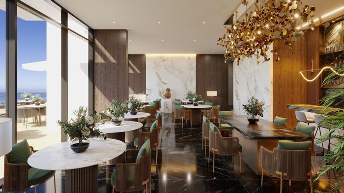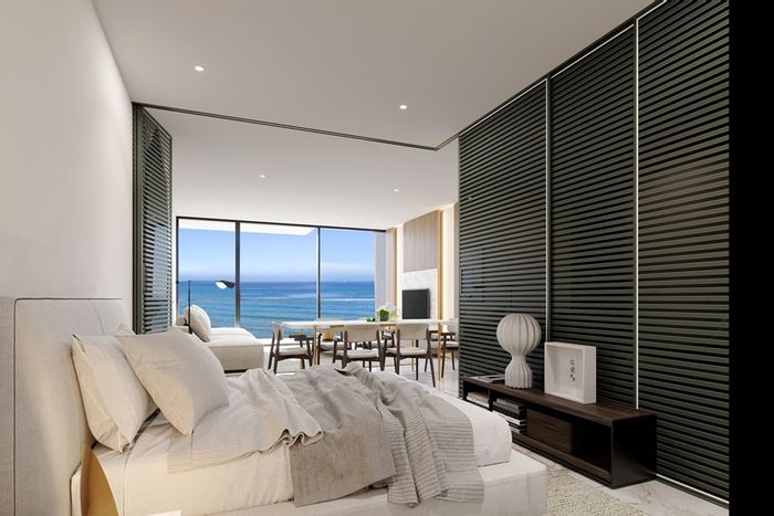 Coastal living with panoramic views of Robben Island, Table Mountain and Bloubergstrand beach; open-plan interior, sleek island kitchen and private balcony — three bedrooms, three bathrooms.