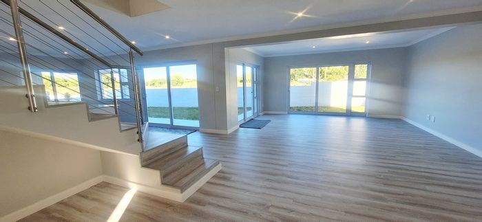 Resort-style family living in Langebaan Country Estate with sea views and greenbelt access — open-plan living flows to a braai room and sunlit patio; three en-suite bedrooms.
