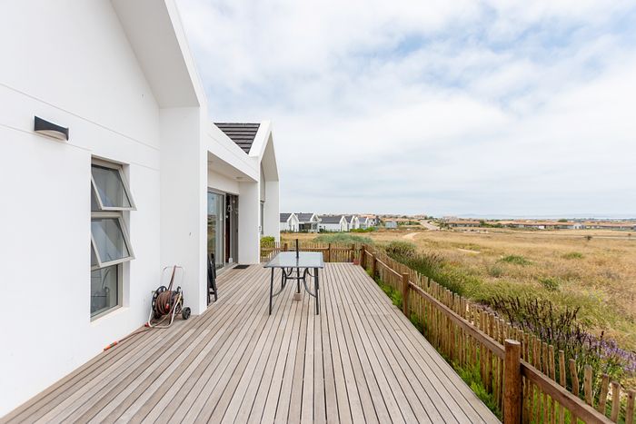 Clubhouse-side living in Chardon Village, Langebaan Country Estate with golf and lagoon access; seamless indoor–outdoor flow to a large wooden deck with built-in braai — three beds, 2.5 baths, four covered parking.
