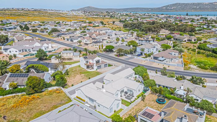 Relaxed coastal living a block from Langebaan Yacht Club and Farmhouse Hotel, with thatch lapa, soaking spa tub and partial lagoon views — five bedrooms, four bathrooms and double garage.
