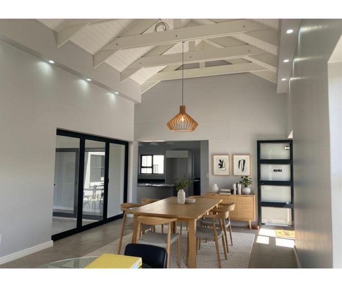 Winelands living in Val de Vie Estate, quiet tree-lined street near main gate; open-plan flow and enclosed patio with frameless doors and built-in braai. Three beds, two baths.