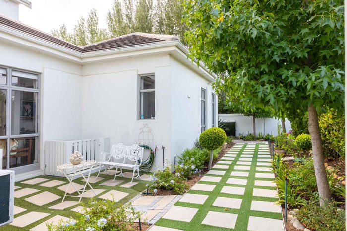 Winelands living in Val de Vie Estate, quiet tree-lined street near main gate; open-plan flow and enclosed patio with frameless doors and built-in braai. Three beds, two baths.