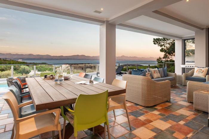 Coastal entertainer in Plettenberg Bay with panoramic Robberg views, seamless open-plan living and terraced landscaped gardens; features twin heated pools, designer kitchen and six bedrooms, seven bathrooms.