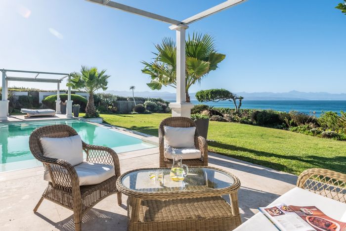 Beachfront living in Keurboomstrand, Plettenberg Bay — private boardwalk to Keurbooms Beach, expansive patio with pool and gas braai, panoramic Robberg-to-Arch Rock ocean views.