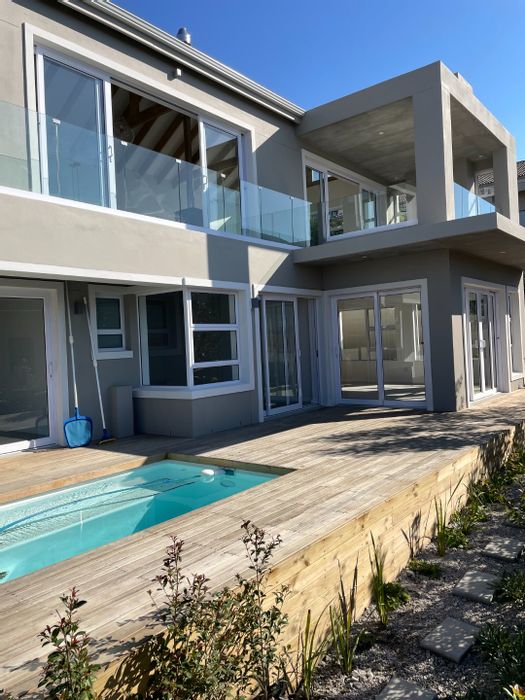 Elevated coastal living in Whale Rock Heights with panoramic Robberg and Tsitsikamma views, north-facing pool and balcony, designer Bay Kitchen, 360-degree fireplace; four en-suite bedrooms and double garage.