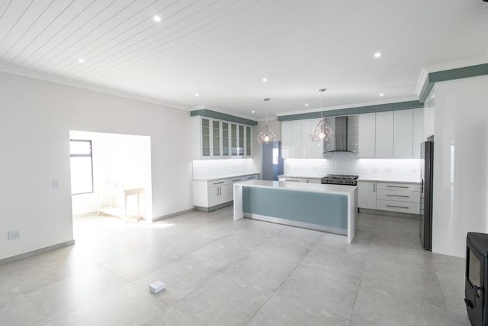 Seaside golf-estate living in Shelley Point: brand-new architect-designed home with high-beam open plan, built-in braai/fireplace, solar geyser and double garage; 3 beds, 2 baths.