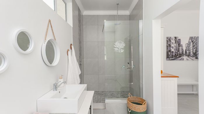 Coastal entertaining and relaxed family living in Struisbaai with ocean-view Romeo and Juliet balcony, open-plan kitchen, built-in braai and landscaped garden. Four bedrooms, three bathrooms, automated garage.