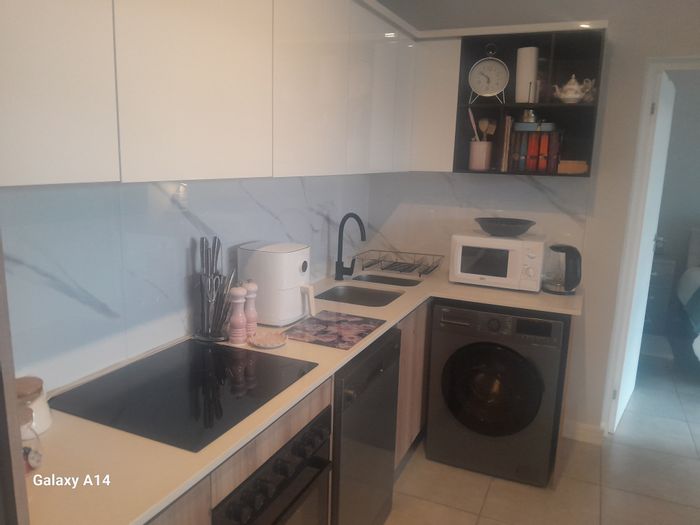 Enjoy effortless suburban living close to Mall of Africa, schools and transport in a modern first-floor apartment with open-plan kitchen (dishwasher, washing machine), two bedrooms and one bathroom.
