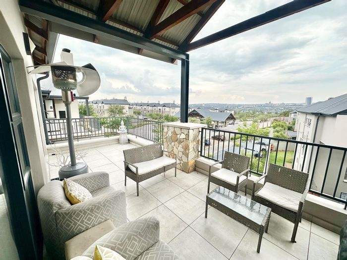 Relax in a top-floor penthouse at The Polofields, Waterfall — panoramic waterfall views from a private covered patio with gas braai, gourmet SMEG kitchen, two bedrooms, two bathrooms, two covered carports.