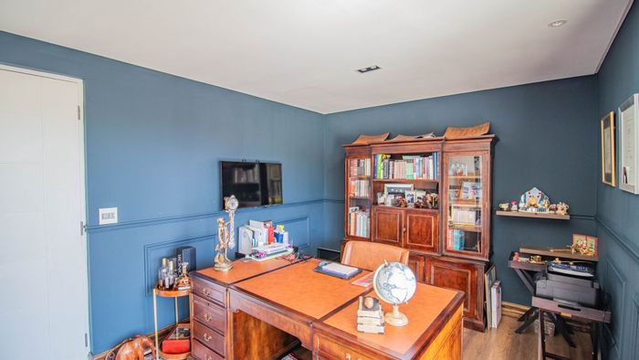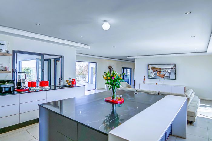 Equestrian paradise in Blue Hills Equestrian Estate, Midrand — direct trail access, manicured garden and pool with Magaliesburg views. Five ensuite bedrooms, air-conditioned and eight covered parking spaces.