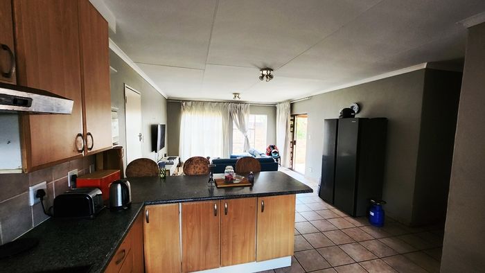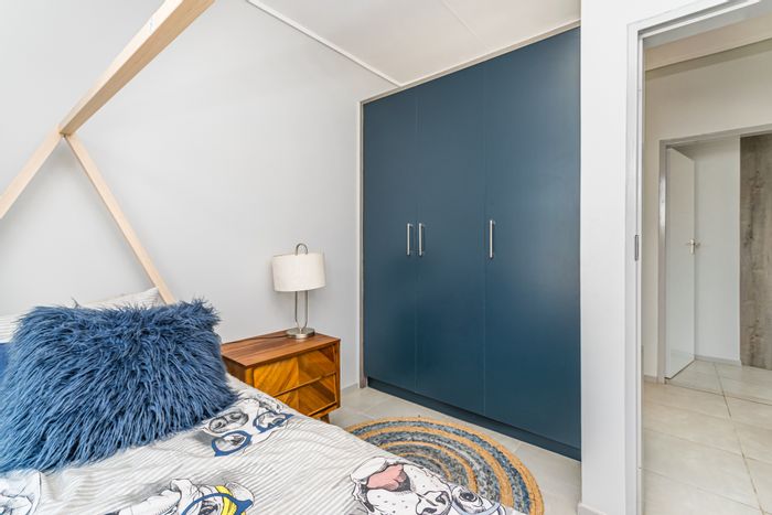 Convenient Rooihuiskraal Centurion living—steps from shops and highways, open-plan kitchen flows to a patio with built-in braai, small secure garden; two bedrooms, one bathroom, covered parking.