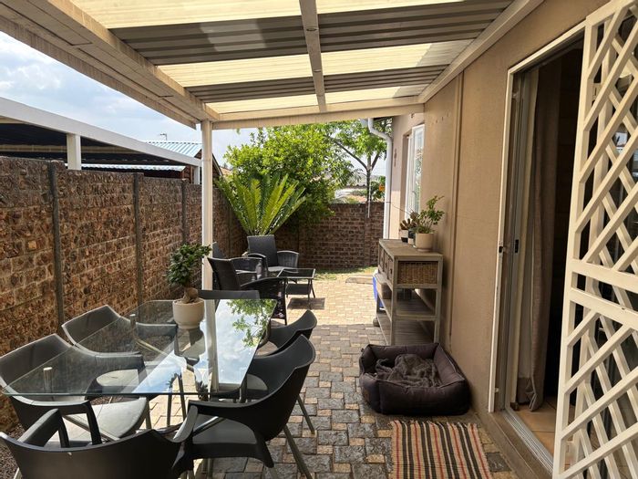 Relaxed indoor-outdoor living in Red Ivory Lane, steps from Greenstone Mall and Modderfontein Nature Reserve. Private garden with covered patio and built-in gas braai; three bedrooms, two bathrooms.