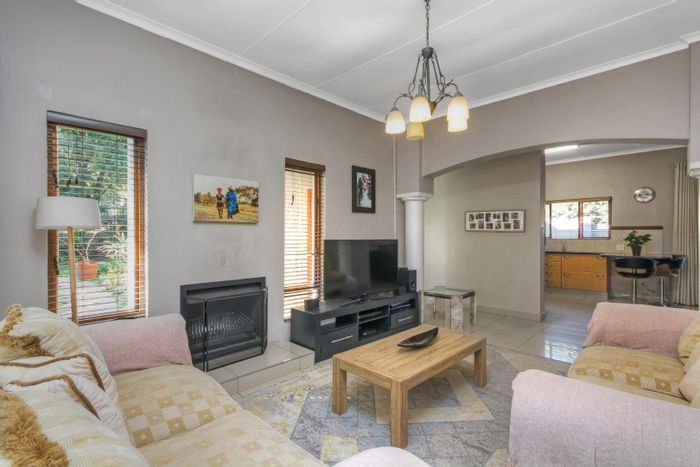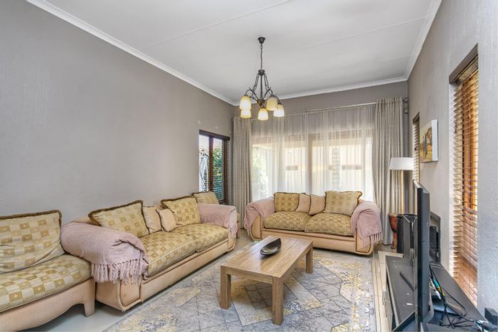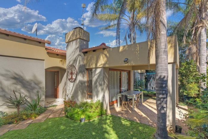 Sunlit cluster home in a 24-hour guarded complex, high ceilings and open-plan living flow to a manicured private garden with veggie plot; converted garage provides flexible 4th bedroom.
