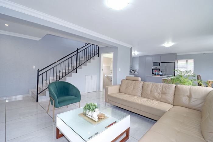 North-facing, renovated double-storey in Noordwyk estate, steps from San Ridge and Mall of Africa — open-plan living with island kitchen, large windows, secure family-friendly setting. 3 beds, 2.5 baths.