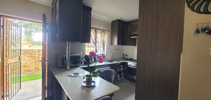 Entertainer's townhouse in secure Honeydew Manor, offering modern open-plan living, a quartz kitchen, enclosed patio with built-in braai, private balcony and four bedrooms, 2.5 baths, double garage.