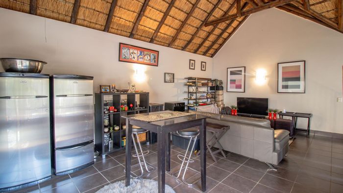 Entertainer's retreat minutes from Montecasino, in a quiet, well-kept complex — open-plan living flows to a paved patio with fitted bar, light-filled atrium, two bedrooms, two baths, single garage.