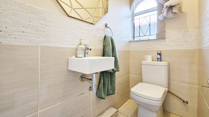Entertainer's garden with built‑in braai and double electronic garage in a well‑located suburban setting; immaculate, spacious rooms with en‑suite plus guest toilet — three bedrooms, two bathrooms.