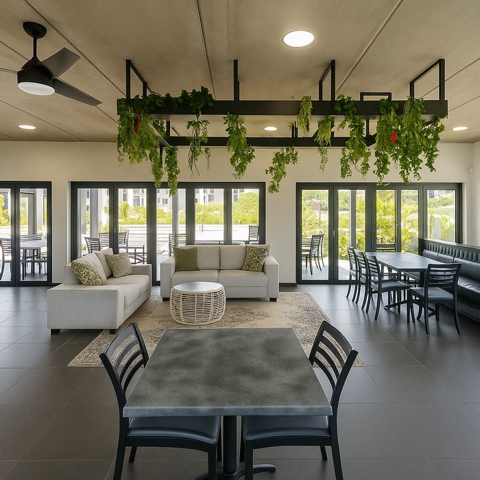Relaxed estate living in Palm Lakes Estate, set amid tranquil greenery with gated private patio and scenic views. Modern open-plan layout; two bedrooms, one bath and two covered parking.