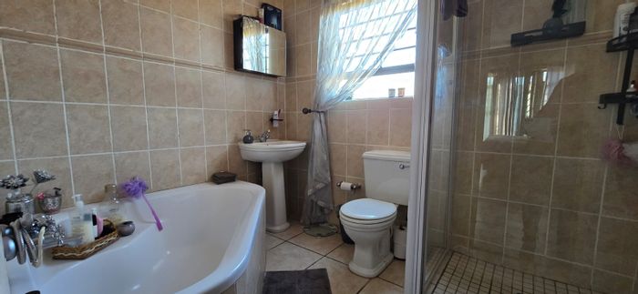 Sunny, secure townhouse on a tree-lined street within walking distance of Doringkruin shopping — enclosed north-facing patio with built-in braai and Jacuzzi, balcony, solar inverter. 3 beds, 2 baths, double garage.