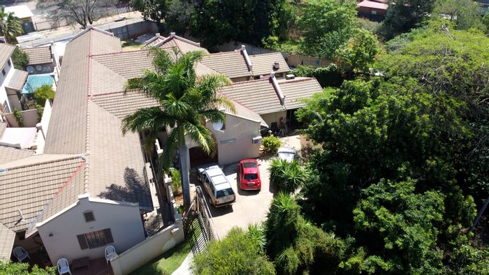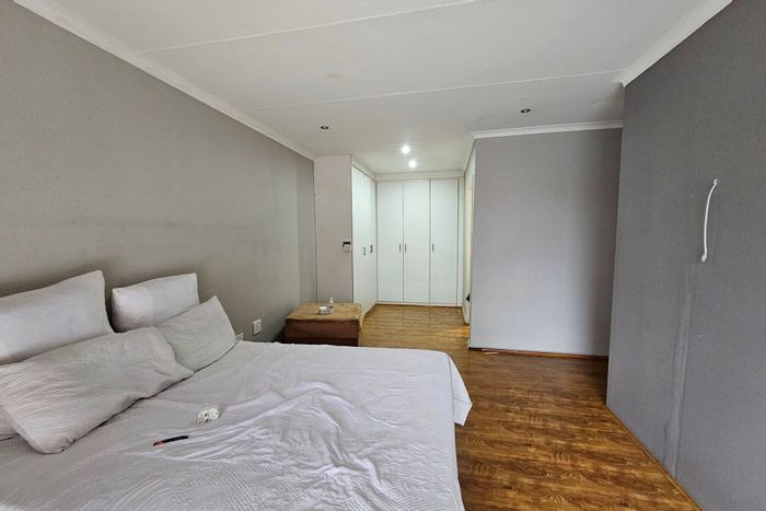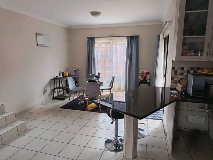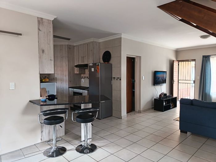 Pet-friendly townhouse in sought-after Waterval East, Rustenburg, with open-plan kitchen and lounge, built-in cupboards, secure complex living — three bedrooms, family bathroom and two covered parking.